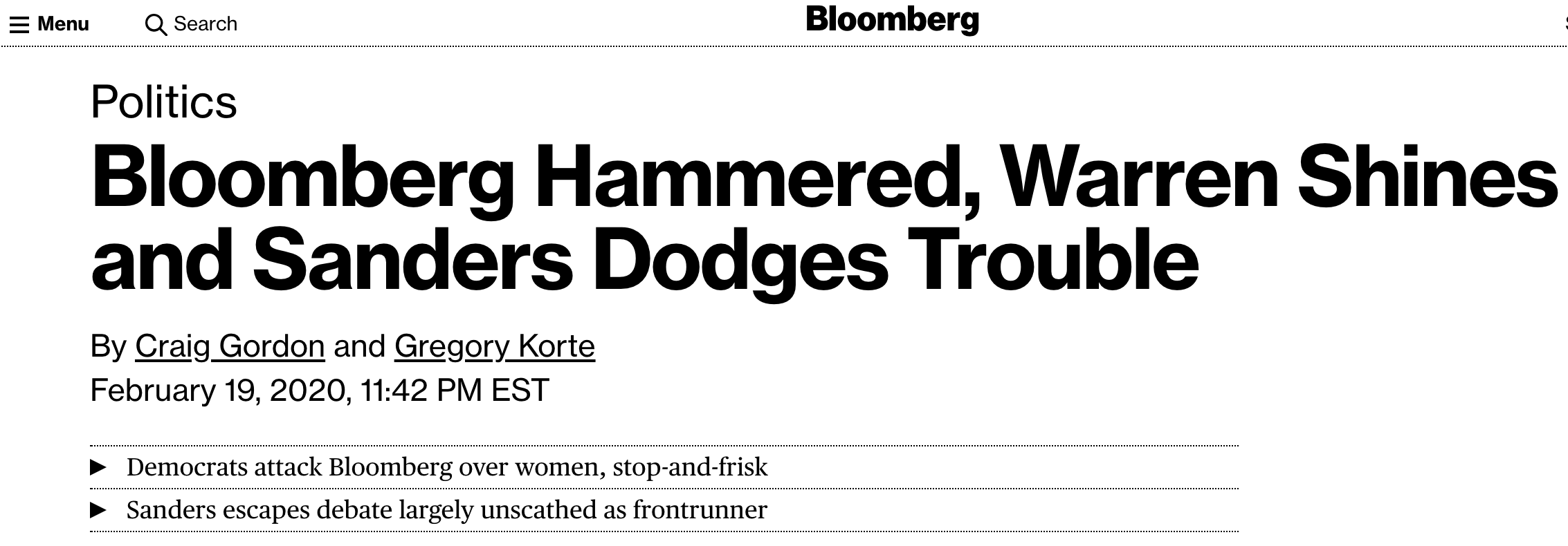 Bloomberg was underwhelming and struggled for the first hour of the debate. Badly. He took lumps out of the gate and a lot of people — including me — expressed shock at how unprepared he looked to be up there. Even his own campaign conceded that it “took him 45 minutes” to get his legs after 10 years without a debate. He got it together late in the game with questions on climate change and job creation. But even Bloomberg News was left running the headline that Bloomberg got “hammered.”