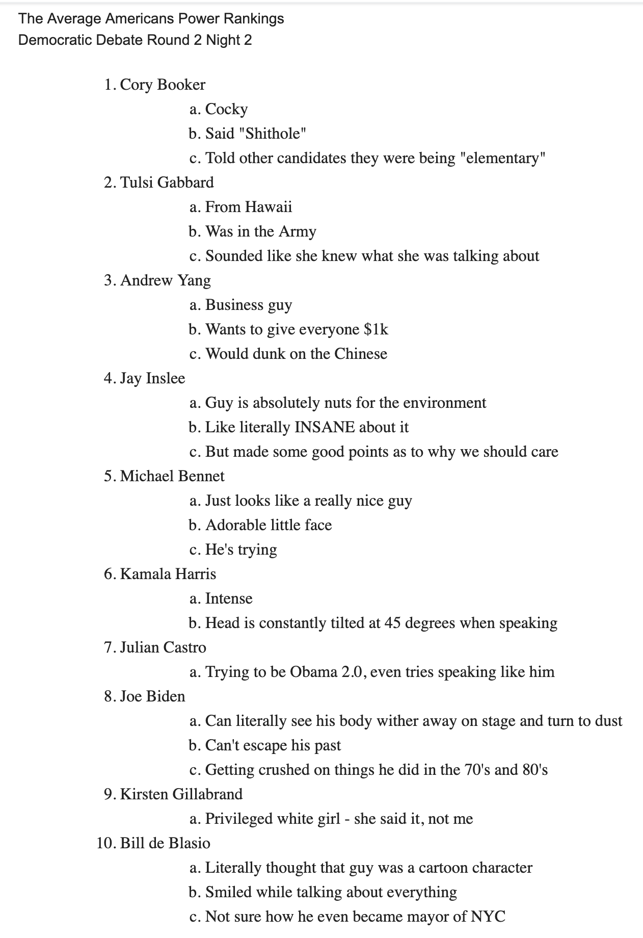 After Tuesday night’s debate, I had the overwhelming feeling that none of this mattered. Last night was different, though. As I documented on Twitter, it was informative to watch the debate alongside my girlfriend, who seemed stunned at Biden’s performance. She asked questions like, “Is he okay?” and “Is he unwell?” throughout the night. Kamala came off like the strongest candidate, but Gabbard’s attack lines will do real damage and are just a preview of what’s to come. Booker, too, had a strong night and seemed prepared in a way other candidates weren’t.