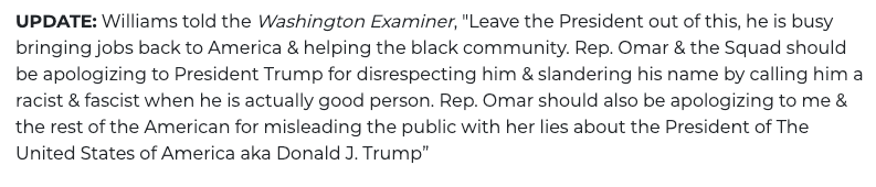 Yesterday, the “comedian and actor” Terrence K. Williams shared a video of Rep. Ilhan Omar on Twitter “partying” and dancing on the anniversary of 9/11. After sharing the video, the President of the United States retweeted Williams claiming Omar “will win us the Great State of Minnesota.” Well, as it turns out, Williams’ tweet was total B.S. —the video he shared was actually a video from Sept. 13th, of Omar dancing at a Congressional Black Caucus event. Williams later deleted the tweet, an obvious piece of propaganda to smear Omar, but the president had already shared it and is yet to remove his tweet. Inexplicably, when contacted by the conservative Washington Examiner, Williams, who is African-American, demanded that Omar apologize to him with the statement below. It was an ugly episode of misinformation, lies and smears that is becoming all too common on the internet.